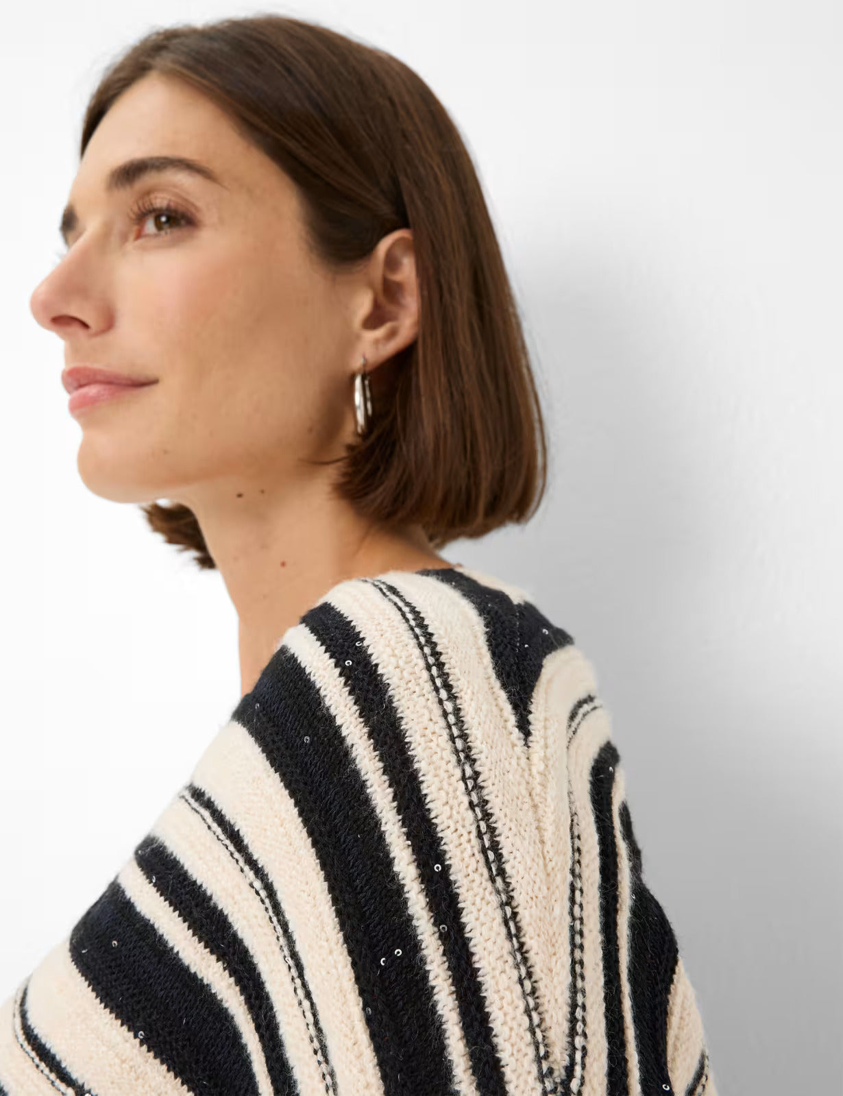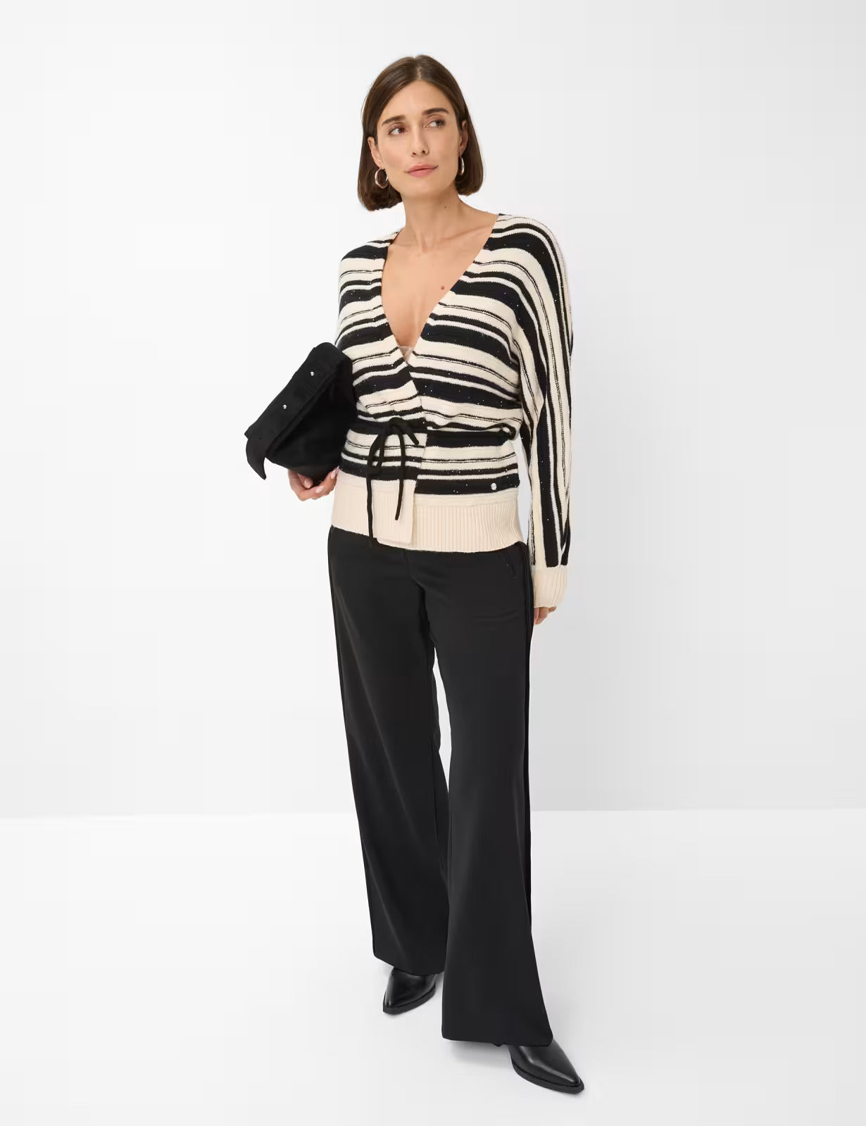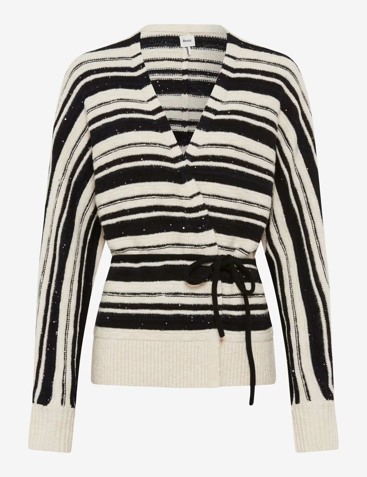 醒目的黑白圖案優雅地貫穿整件開襟衫,賦予其動態輕盈的質感。精緻優雅:柔美的裹身造型搭配繫帶腰帶,優雅地凸顯腰線,並提供可調節的修身剪裁。前開襟設計賦予整件單品休閒的氣息。