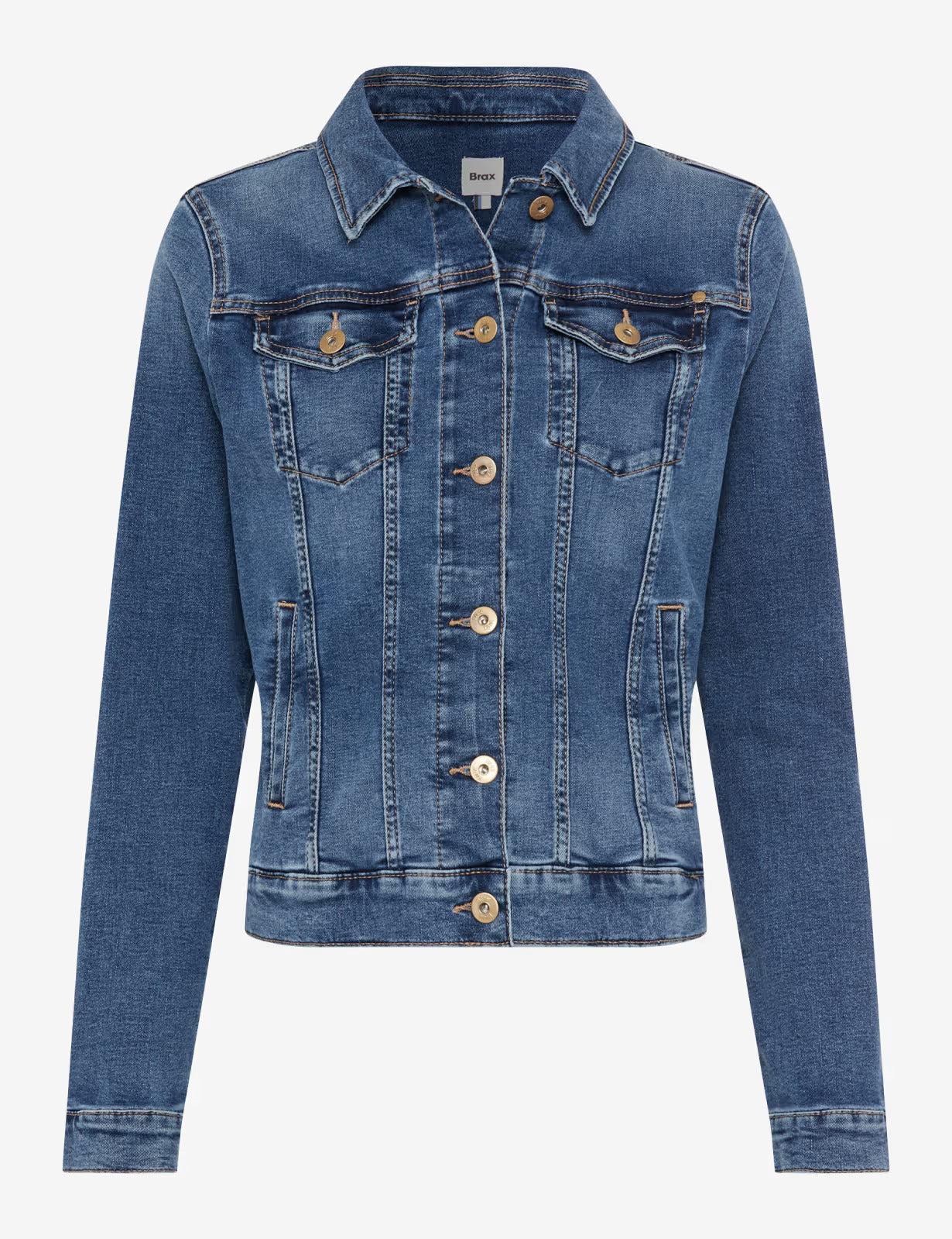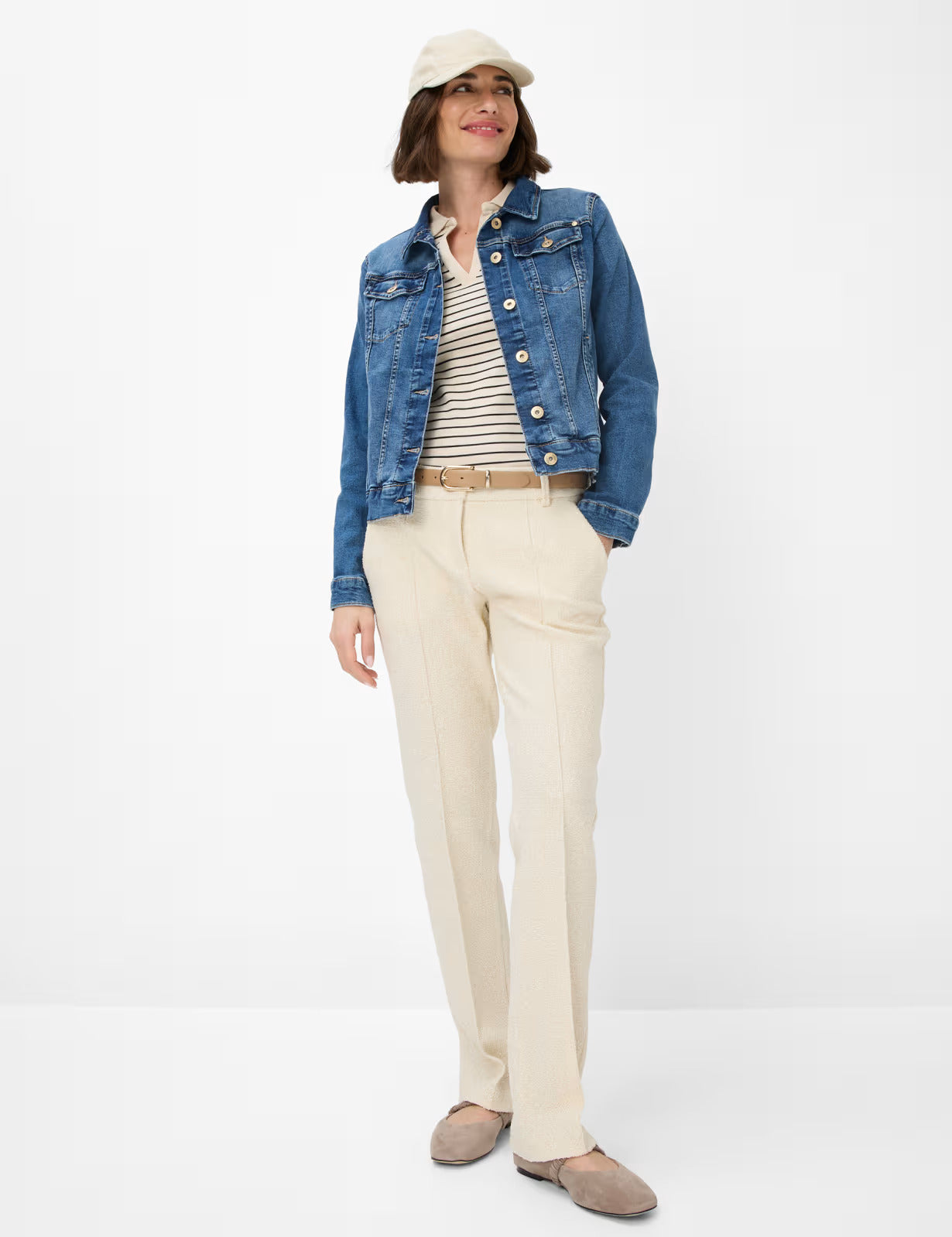 其略微剪裁的輪廓確保了女性化的貼合感,而垂直接縫則進一步突出了這一點。粗體按鈕增加了視覺趣味。這款夾克採用真實的舊處理工藝,賦予其一絲清涼感,是都市裝扮或夏季外出的完美伴侶。