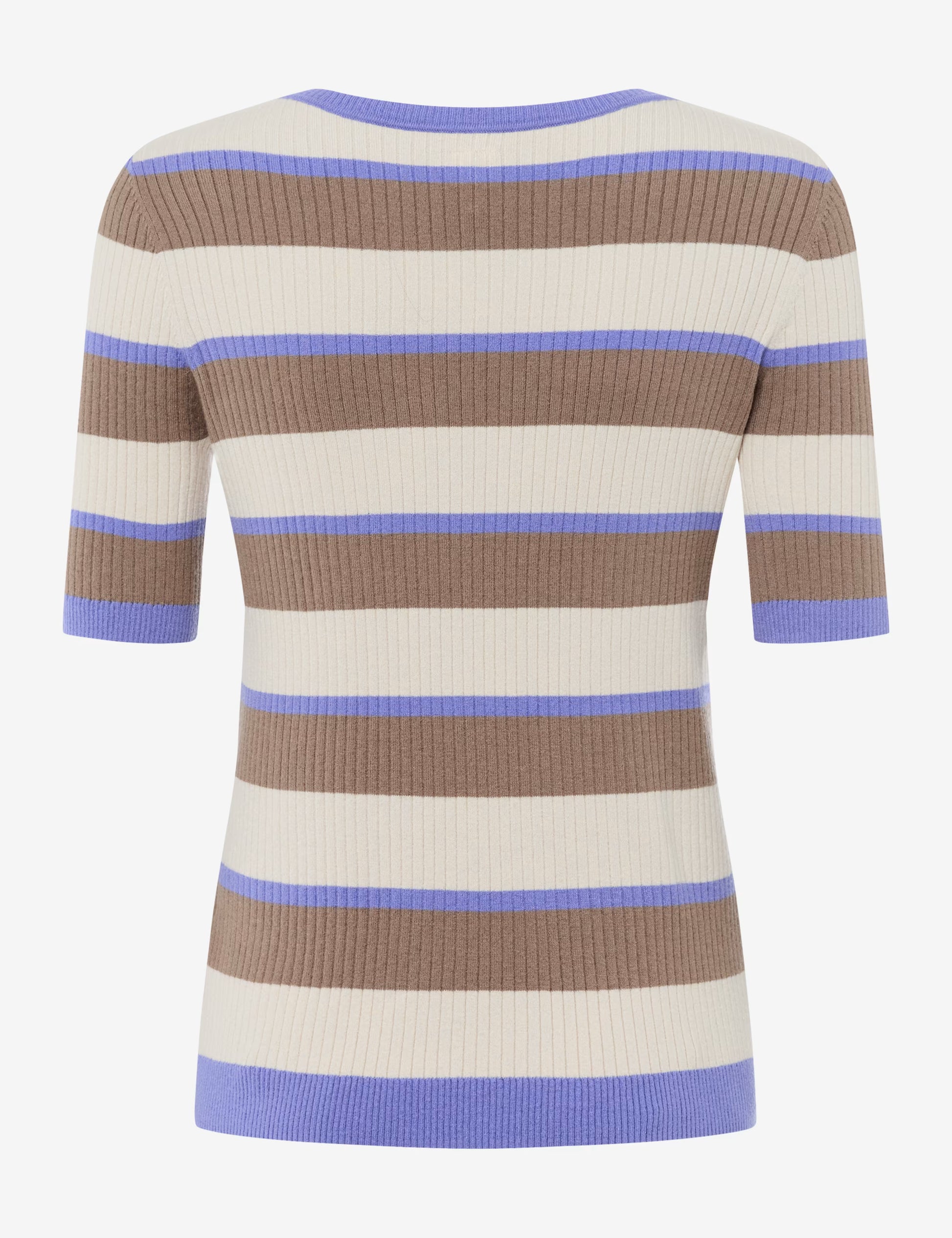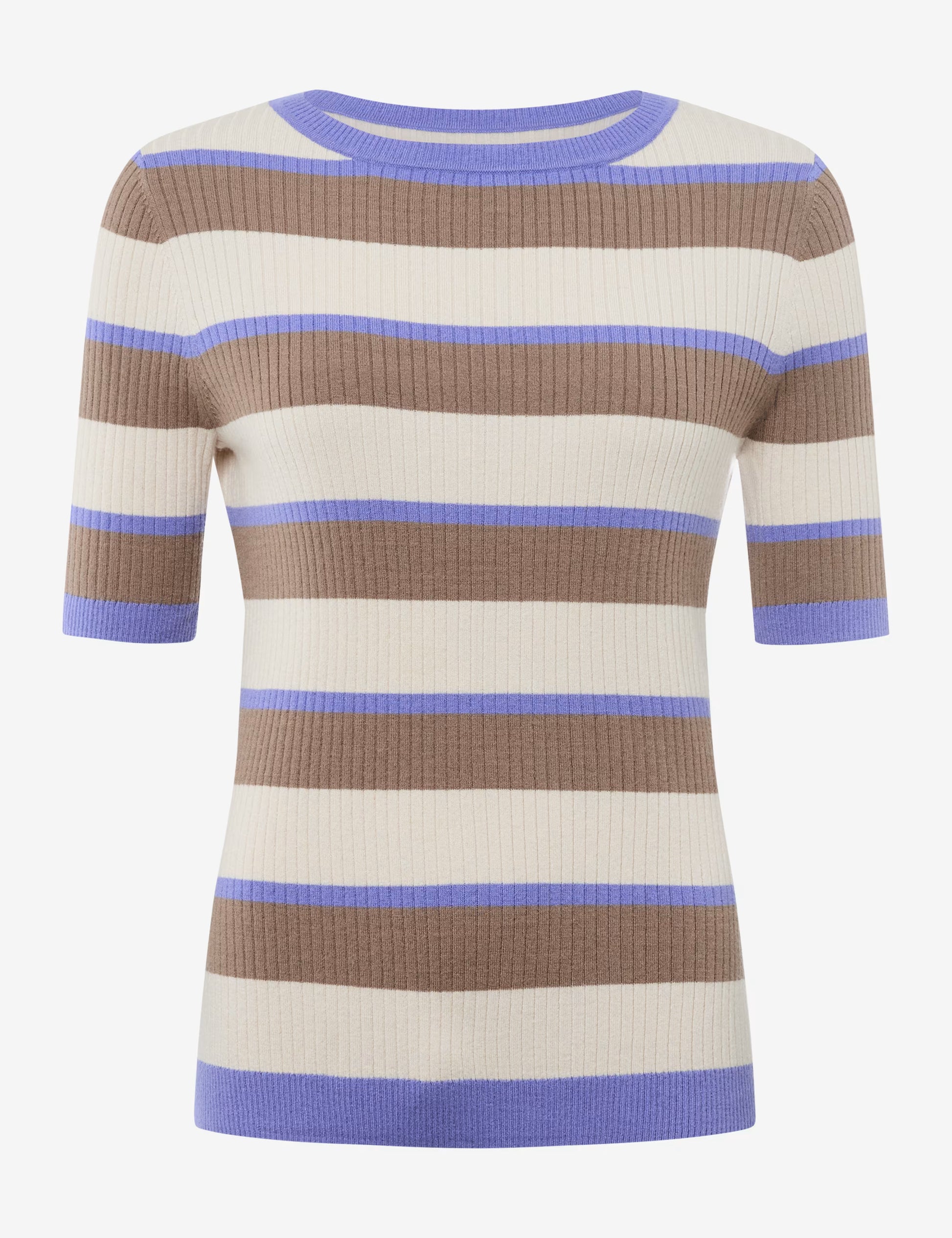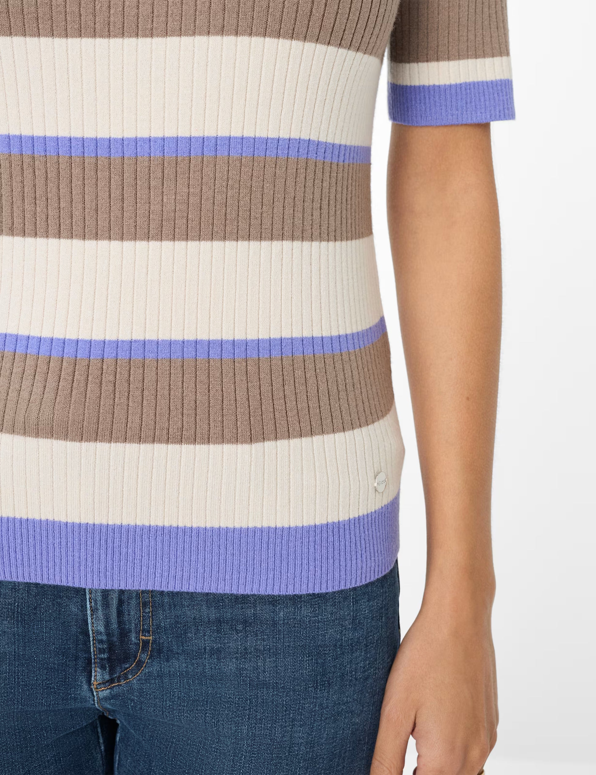 這款圓領針織毛衣以其獨特的條紋圖案,在當下流行的秋季色調中,瞬間吸引眼球。尤其成功的是,它不僅將時下流行的紫色作為條紋,還作為下擺的點綴。此外,這款半袖毛衣的設計也十分經典。