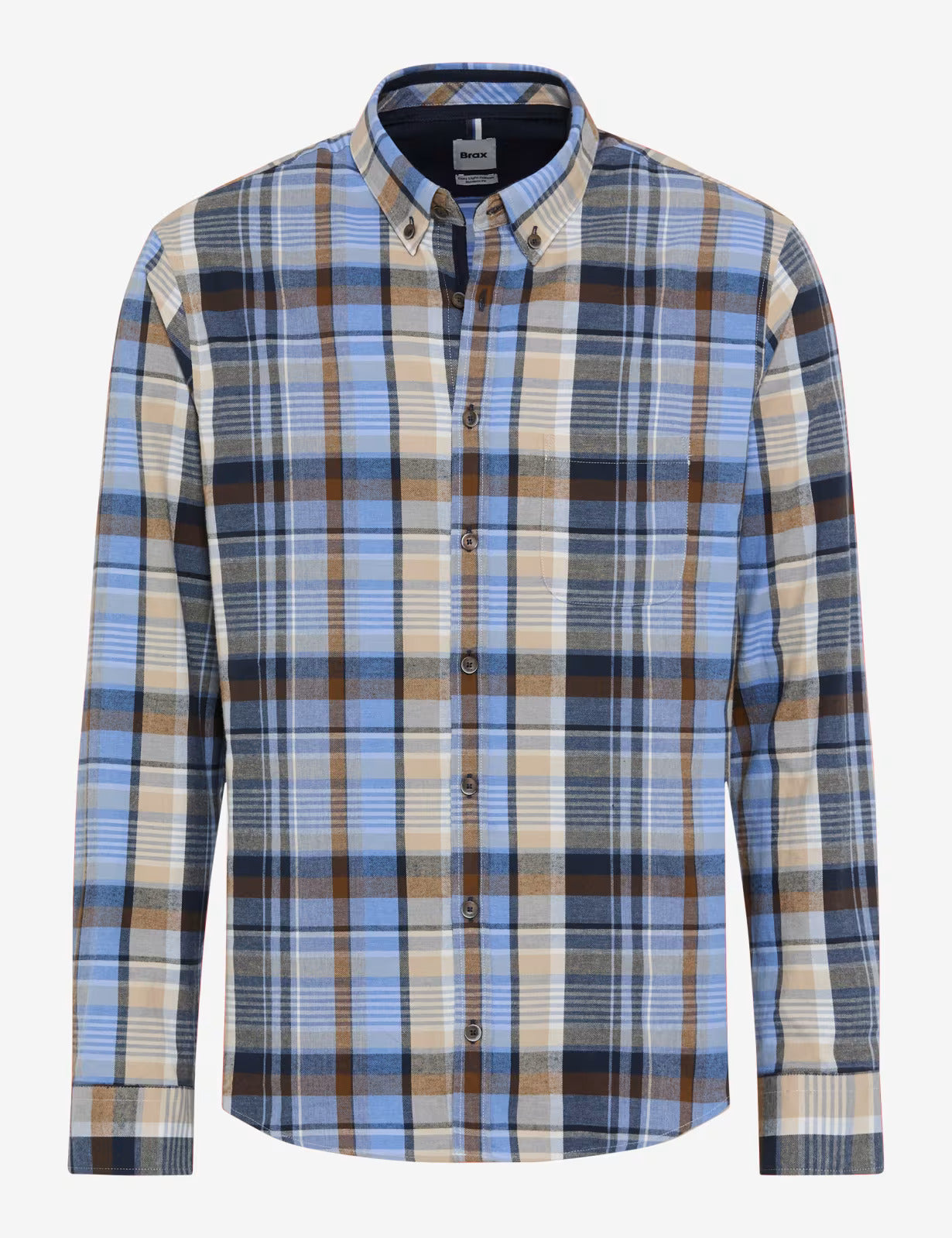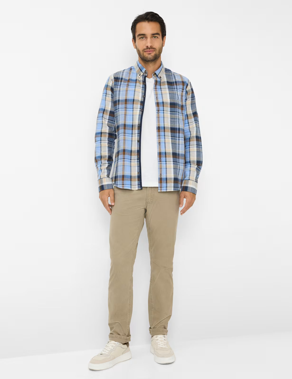 經典的紐扣領和胸前口袋與這款男士襯衫的經典設計和諧契合。大面積的格紋圖案賦予襯衫富有表現力的外觀,既可休閒又可正式。