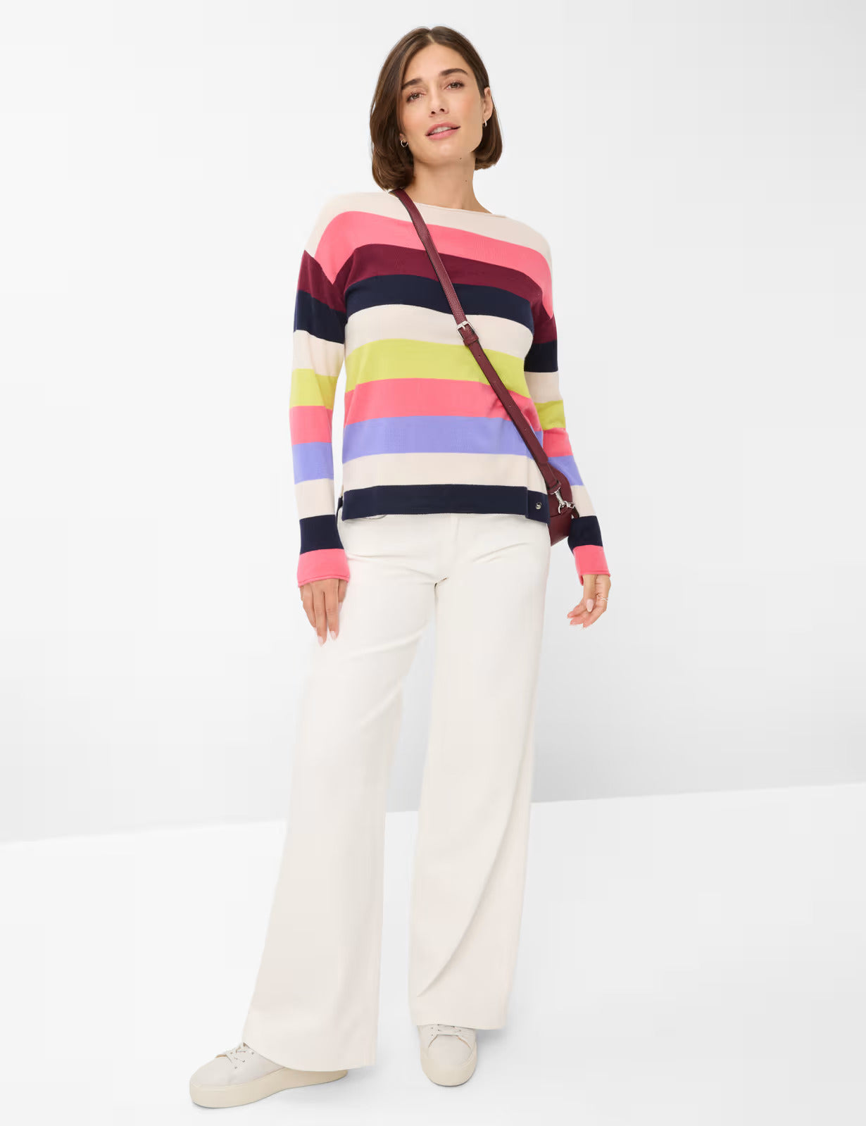 這款毛衣以彩色塊狀條紋展現色彩。船形領口和隨興的落肩設計賦予其現代女性的輕盈感,簡潔的線條則打造出時尚的輪廓。橫條紋的運用,讓整體風格既動態又和諧。