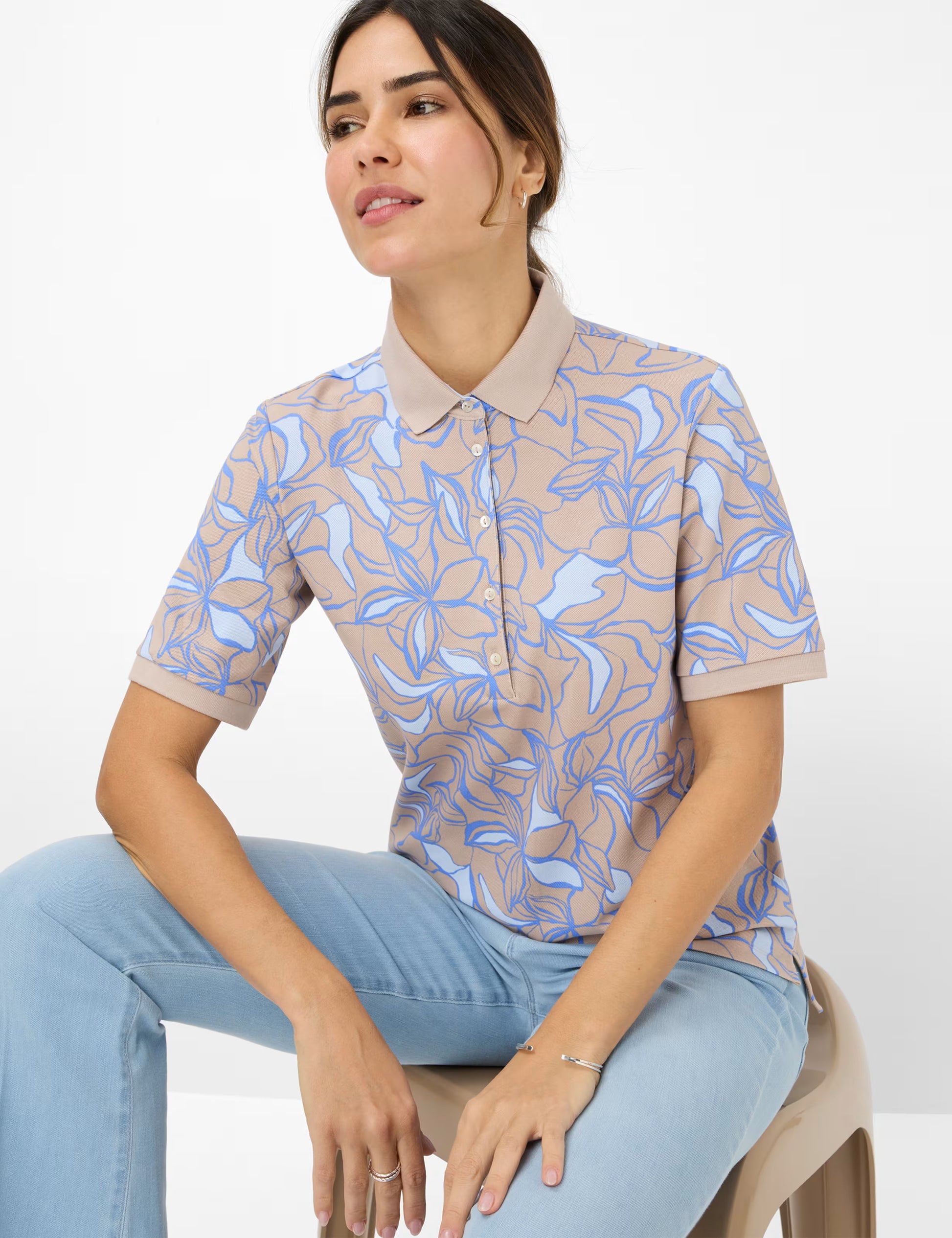 經典的紐扣條與彩色馬球領彰顯運動氣息。花卉印花賦予設計女性化的輕鬆感,讓襯衫成為時尚休閒裝的理想搭配。